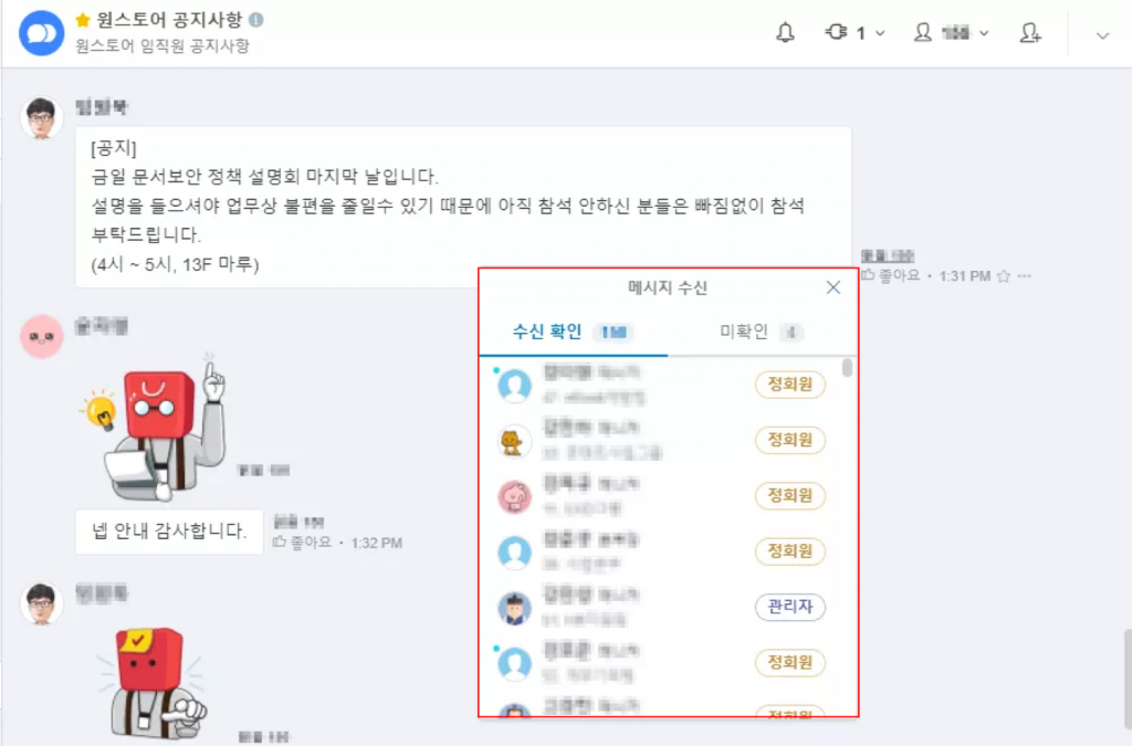 7. 수신 확인: 누가 메세지를 확인 하였는지 알면 대응 시간을 가늠할 수 있어서 커뮤니케이션 속도가 빨라집니다.