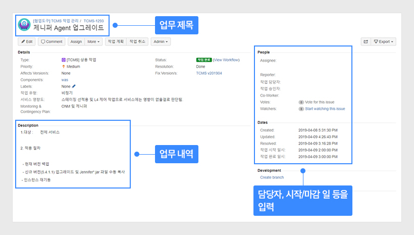JIRA에 개발 업무를 등록하여 의사 결정자에게 승인을 받고 관련 담당자들에게 해당 내용을 공유할 수 있습니다.