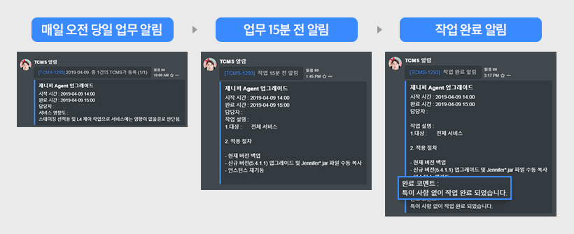업무 내역과 시작일, 마감일을 입력하면 해당 일자에 맞게 잔디로 알람을 보내어 마감기한을 놓치지 않도록 하며, 업무 완료 시 완료 코멘트를 남겨 해당 업무가 완료되었음을 공유할 수 있습니다.
