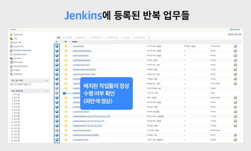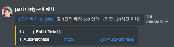 JAVA로 제작된 오픈소스(Continuous Integration) 툴인 Jenkins에 대량의 반복 업무들을 등록하면 정해놓은 시간이 되었을 때 각각의 작업들이 정상 수행되었는지 확인할 수 있습니다. 이 Jenkins를 잔디와 연동하여 각 작업들의 결과를 모니터링 할 수 있으며 이상 발견 시 아래와 같은 알람을 받게 됩니다.