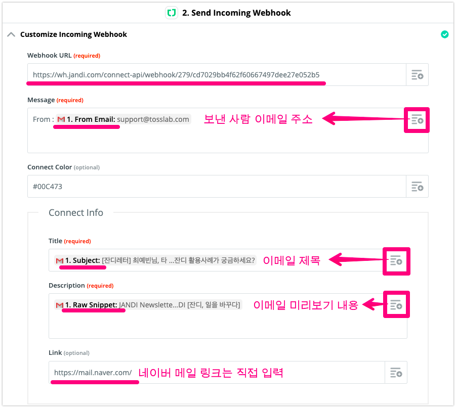 4-9) 잔디 메시지로 받을 웹훅 정보를 설정합니다.