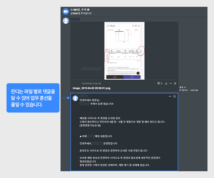 이전엔 사내 소통으로 그룹웨어를 사용하였습니다. 그룹웨어 내 메신저는 그룹 채팅과 모바일을 지원하지 않아 외근이 잦은 촬영팀, 엠디팀 등은 임시 방편으로 카톡을 종종 사용하였습니다. 시장조사 시 사진을 찍어 직원들과 공유해 컨펌받는 업무 방식인데 카톡으로 한번에 수십장 씩 업로드하면 어떤 사진인지 일일이 설명하고 또 사진 별로 컨펌 받는 것도 혼란이 와서 순조로운 업무 진행이 어려웠습니다. 업무 정리가 잘 안 돼서 파악하기 어려웠고 공과 사가 구분이 안 돼 잘못 전달되는 보안의 문제도 있었으며 카톡에 파일을 올리고 설명은 전화로 하다보니 업무 증빙이 어려운 일도 발생했습니다.