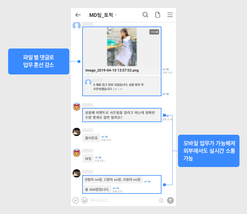 2. 담당자 부재 시 업무 논의가 어려워 잦은 미팅과 전화를 통한 업무 소통으로 딜레이가 종종 발생하였습니다. 하나의 제품을 생산하기 위해 컨펌하는 기간이 보통 3~4일 정도 걸렸는데 이젠 모바일로도 업무와 자료 공유가 실시간으로 진행되어서 반나절로 단축되었으며 불필요한 미팅도 사라졌습니다.