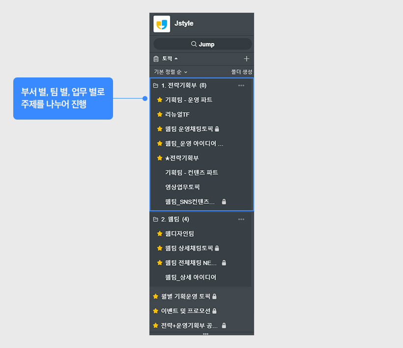 1. 주제 별 대화방: 업무 관계자들과 하나의 주제로 논의하여 집중도와 처리속도가 빨라졌습니다.