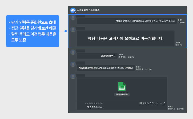 3. 확실한 업무 전용 툴이 있기 때문에 이제는 개인용 메신저를 아예 사용하지 않게 되어 업무 자료가 유출되는 일도 발생하지 않게 되었습니다.