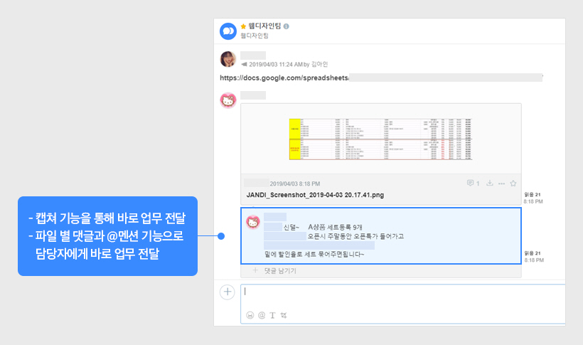 3. @멘션: 여러명이 참여한 토픽의 경우엔 담당자를 지정하여 @멘션으로 업무를 전달해 중요성을 알리고 놓치지 않도록 합니다.