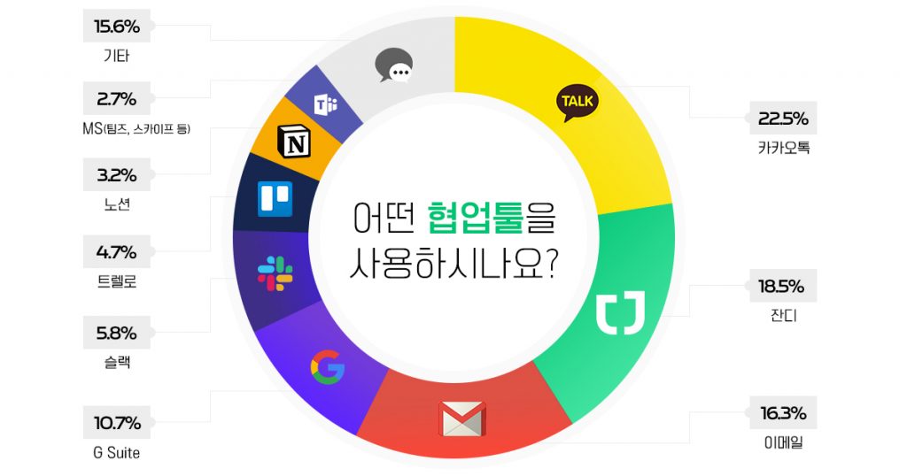 협업툴에 관심을 두고 참가를 신청해주신 분들은 이미 다양한 협업툴을 사용하고 계셨습니다. 참가자 중 협업툴로 가장 많이 사용하는 카톡(133명/22.5%)은 개인용 메신저임에도 불구하고 전 국민이 사용하는 범용성으로 인해 아직도 많은 기업에서 사용하고 있습니다. 2위인 잔디(109명/18.5%)는 ‘프로젝트(주제)’ 중심의 대화방에서 메신저 형태로 대화를 나눌 수 있게 한 잔디(JANDI)는 앞서 설명한 슬랙는 달리 아시아에 특화하여 한국, 대만 뿐만 아니라 동남아시아에서도 사용자가 증가하고 있습니다. 3위는 이메일(96명/16.3%)은 인사말, 서식, 파일 검색 등 많은 불편한 점들이 있지만, 비즈니스 커뮤니케이션의 기본이기 때문에 아직도 많이 사용하고 계십니다. 4위 G Suite(63명/10.7%)는 글로벌 기업인 구글이 만들었으며, 스프레드시트, 파워포인트, 챗봇, 메일, 캘린더 등 27개의 다양한 업무용 도구를 사용할 수 있습니다. 그 외에도, 노션, 트렐로, 지라, 슬랙, 스마트시트 등 다양한 협업툴을 사용한다고 집계되었습니다.