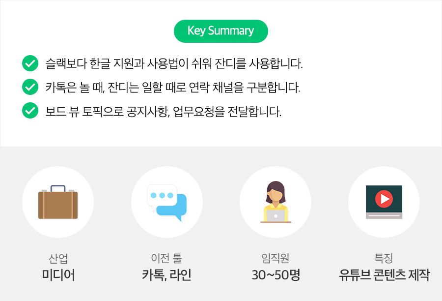 슬랙도 검토했었지만 영문 서비스이고 한글을 지원하지 않다 보니 전사에서 사용하기에는 불편하다는 결론을 내렸습니다. 반면 잔디는 한글 서비스일 뿐만 아니라 사용법이 직관적이고 쉬워 지금까지 유니브 팀의 중심 협업툴로 쓰고 있습니다.