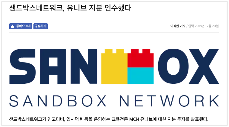 2018년 12월에는 종합 MCN 기업 샌드박스네트워크에 유니브가 인수되면서 더 다양한 사업에 투자를 할 수 있는 계기가 되었습니다.