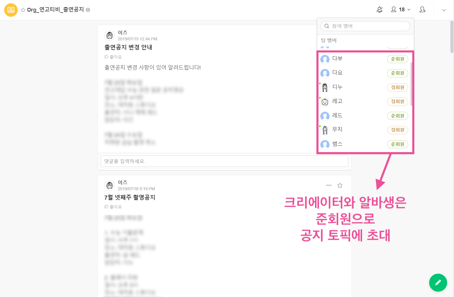 영상 촬영 현장에 투입되는 크리에이터분들과 아르바이트생들은 준회원으로 각자 참여하는 보드 뷰 토픽에서 촬영 스케줄과 출연 일정을 확인합니다.
