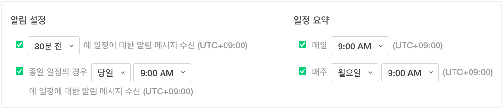 잔디 커넥트 캘린더 설정 화면에서 매일 ‘일정 요약’ 기능을 이용해 아침에 오늘 휴가자 목록을 알림으로 받고 있습니다. 또한 구글 캘린더를 부서별로 토픽에 연동하니, 오늘 우리 팀의 일정 역시 아침 10시에 쭉 받아보아 멤버들이 출근 시 오늘의 업무를 파악할 수 있도록 만들었습니다.