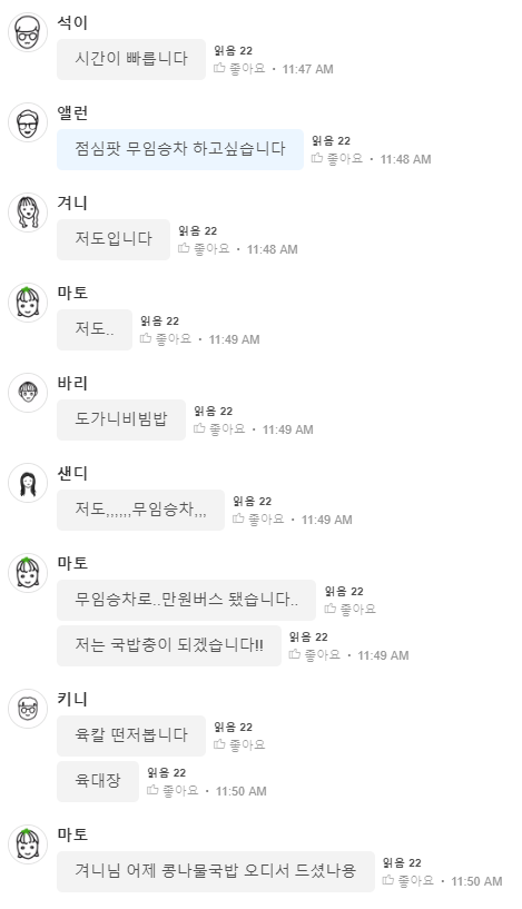 직장인이 가장 기다리는 시간 점심시간이 아닐까 싶은데요, 같이 점심을 먹을 멤버를 모을 때 대화방이 가장 활발한 것 같아요 ^.^