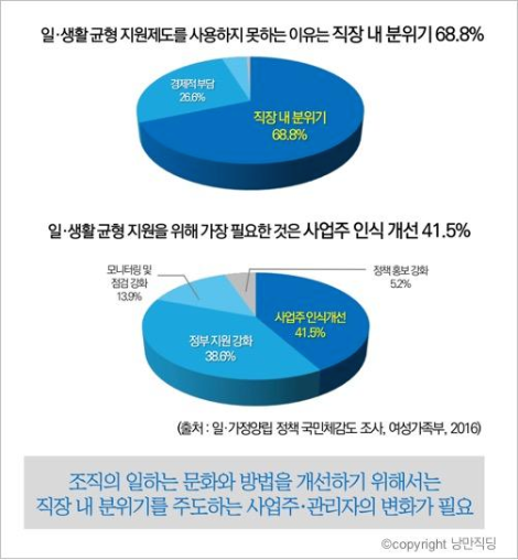 워라밸을 실현하지 못하는 원인을 모두 리더들에게 돌리고 싶은 생각은 없습니다. 상사의 생각은 무조건 구시대적이고, 소위 말하는 밀레니얼 세대들의 생각이 모두 옳다는 것도 아닙니다. 다만, 업무 방식이 워라밸 실현의 걸림돌이 되고 있으며, 리더가 조직에서 업무 방식을 결정하는 열쇠가 되는 만큼 리더들이 조금만 더 신경을 써주길 바랄 뿐입니다.