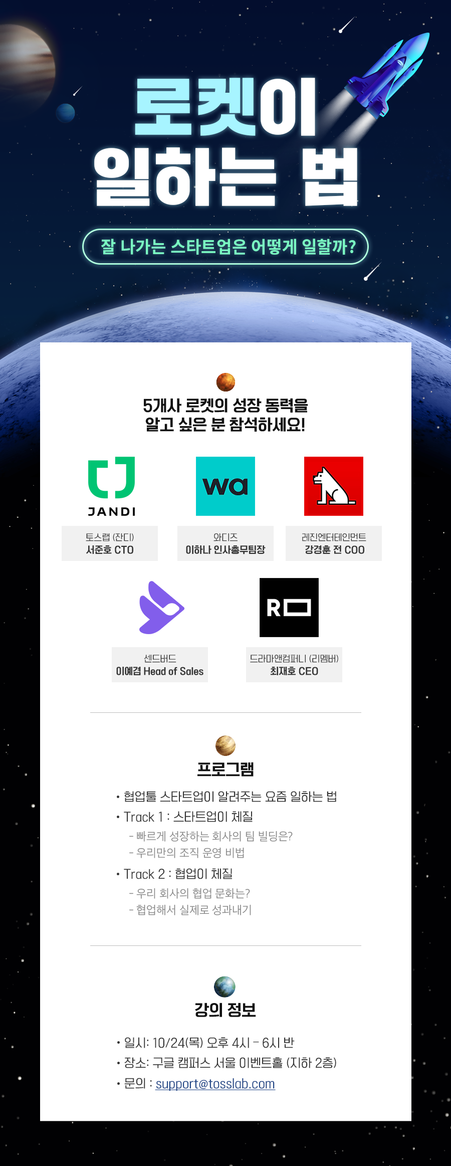 [세미나] 로켓이 일하는 법 게시일: 2019. 10. 08 Share 🕑 리딩타임: < 1 분[ 신청하기 ] [ 신청하기 ] 포스트 뷰: 1,041 JANDI생산성스마트워크스타트업업무 효율성 Share