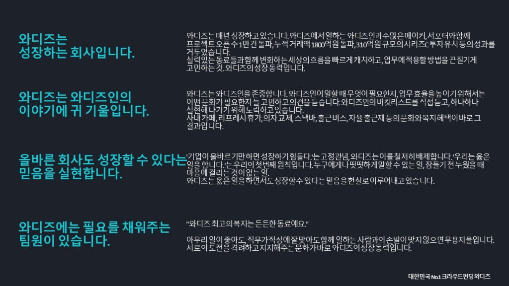 - 채용 배경/직무 사례 설명 : 채용 공고 및 JD(Job Description)에는 채용 배경과 와디즈에서 하게 될 기대 역할을 자세히 기술합니다. 이 때, 실제 직무를 담당하는 사람의 사례를 곁들이도록 하고 있습니다.