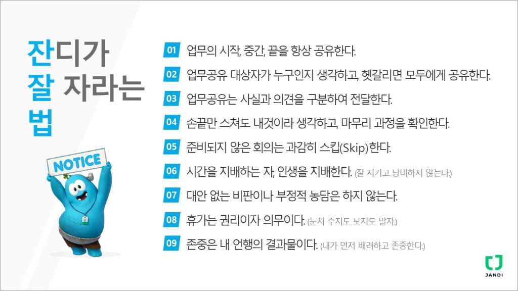 - 잔디 브리핑 : 매주 1회, 지난 주에 있었던 일과 이번 주 집중해야 할 일을 모든 멤버들과 공유합니다.