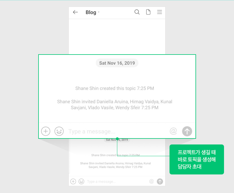 Blog 토픽처럼 사내 프로젝트가 생기면 TF 대화방을 빠르게 만들고 담당자를 초대해 내용들을 주고 받습니다.
