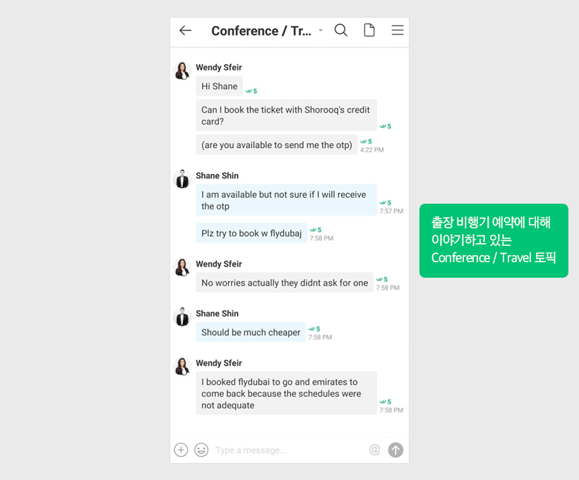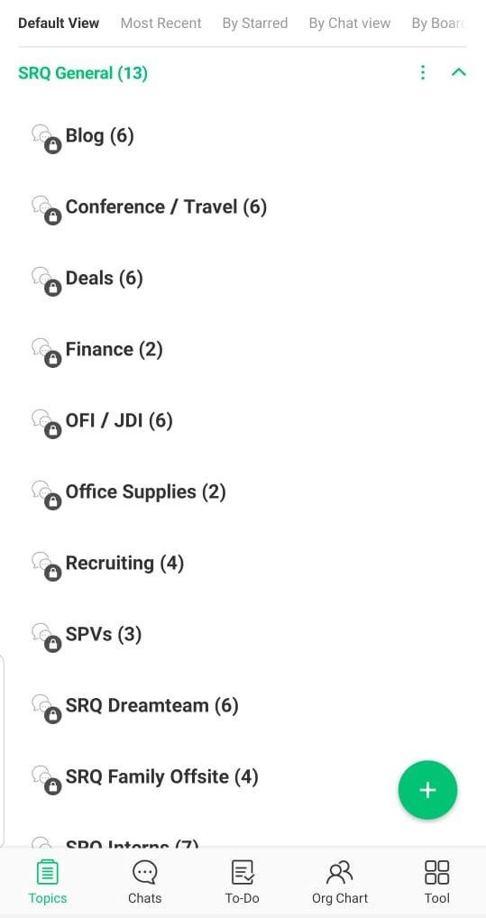 채용, 비품 구매, 재무, 법무 등 우리 회사 내 업무 주제별 토픽은 ‘SRQ General’ 폴더에 넣어둡니다. 예를들어 ‘Finance’ 토픽에서는 투자 펀드 잔액을 담당자와 확인해 자산 운용 현황을 효율적으로 파악합니다. ‘Conference / Travel’ 토픽에서는 출장 일정 및 예약과 관련된 내용을 빠르게 주고 받습니다.