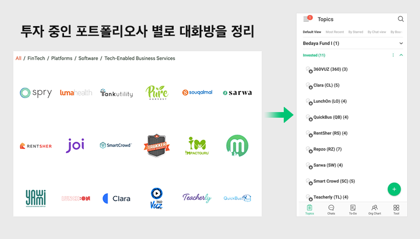 Shorooq Partners는 포트폴리오 회사들과 매우 밀접하게 커뮤니케이션을 해서 빠른 성장을 도와주고자 노력합니다. 따라서 매일매일 VC와 투자받은 회사가 서로 연락하기도 하는데, 이 연락 채널로 잔디를 사용하고 있습니다.