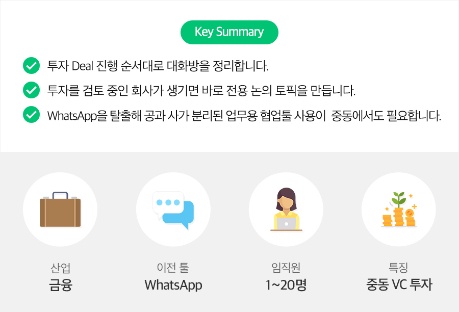 잔디 도입 전 여느 중동 회사들이 그렇듯, 한국의 카톡과 같은 개인용 메신저 웟츠앱(WhatsApp)을 업무용으로 사용했습니다. 개인과 업무 채팅 대화방이 구분이 되지 않아 너무 불편했습니다. 업무 대화방 중에서도 VC는 특성상 투자 단계별로 여러 관계사와 복잡하게 얽힌 대화방이 계속해서 만들어집니다. 그런데 WhatsApp으로는 하나의 관계사 대화방에서 주제별로 내용을 구분하지 못하고 여러 얘기가 뒤죽박죽 오고 갔습니다. 따라서 이 수많은 대화방을 정리할 수 있는 협업툴이 필요해 잔디를 도입하게 되었습니다.