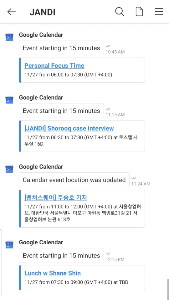 VC는 외근과 미팅이 특히 많습니다. 본인 스케줄을 스스로도 기억하기가 힘듭니다. ^^;; 그래서 구글 캘린더 알림을 받을 수 있는 잔디 커넥트 연동을 좋아합니다. 일정이 생성되거나 변경될 때 잔디 알림 메시지가 자동으로 옵니다. 또한 일정 15분 전에 리마인드 알림으로 회의에 늦지 않도록 도와줍니다.