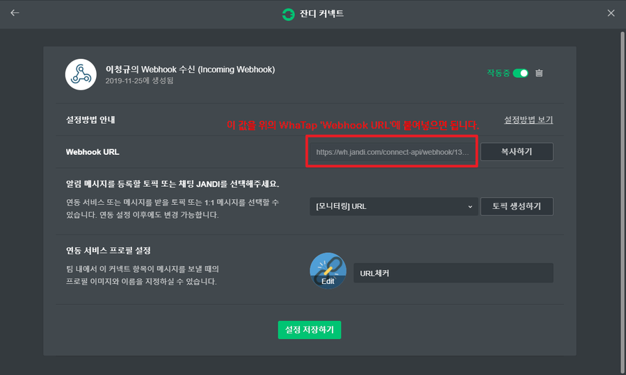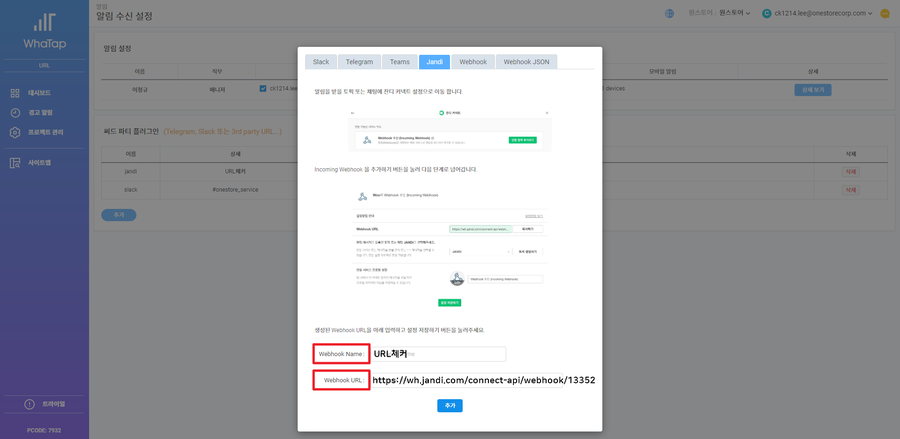 WhaTap과 JANDI를 연동하려면, Webhook Name 과 Webhook URL 이 필요합니다.