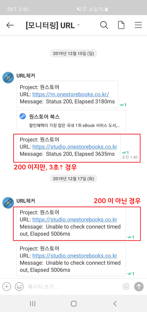 1) 정상 응답이 200이 아닌 경우와 2) 정상 응답이 200이지만, 3초 이상 걸리는 경우 저는 JANDI(잔디)에 경고 알림 메시지가 전송 되도록 설정했습니다.