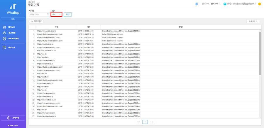 WhaTap 화면에서는 오늘을 기준으로, 최대 한 달 동안 발생한 알람도 전체 목록을 확인할 수 있습니다.
