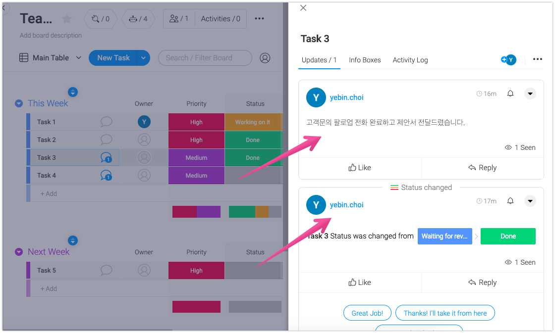 - Update : Status 변경, 댓글 등 Task 의 각 업데이트 내역