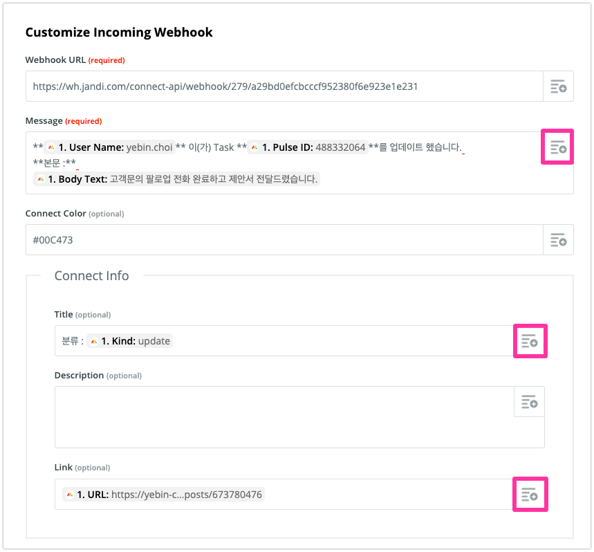 3-8. 잔디 메시지로 받을 웹훅 정보를 설정합니다.