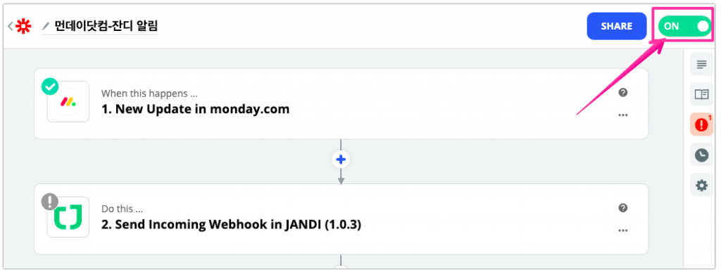 3-10. 완료 뒤에는 꼭 Zap을 우측 상단 화면에서 [On]으로 켜주세요. On이 되어 있을때만 아래와 같이 연동된 메시지가 들어오는 걸 확인할 수 있습니다.