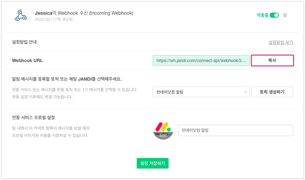 - 웹훅 URL에 있는 URL은 ‘복사하기’ 버튼을 클릭해 복사합니다.