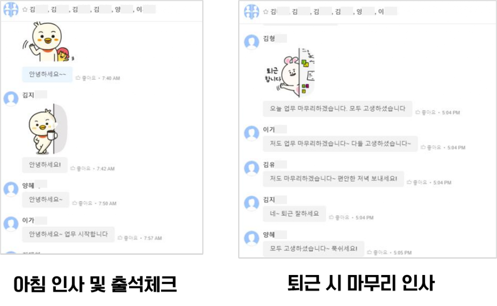 근무 시작할 때에는 출근 확인을 위하여 그룹챗에서 아침 인사를 하고 퇴근 시에 모두 함께 마무리 인사를 하고 있습니다. 또한, 공유가 필요한 파일은 업무 별 토픽에 공유하고 담당자가 확인하면 꼭 확인했다는 댓글을 달고 있습니다. 회의도 잔디로 진행하고 잔디 투표하기 기능을 이용하여 점심 메뉴를 보다 민주적으로 정하기도 합니다.