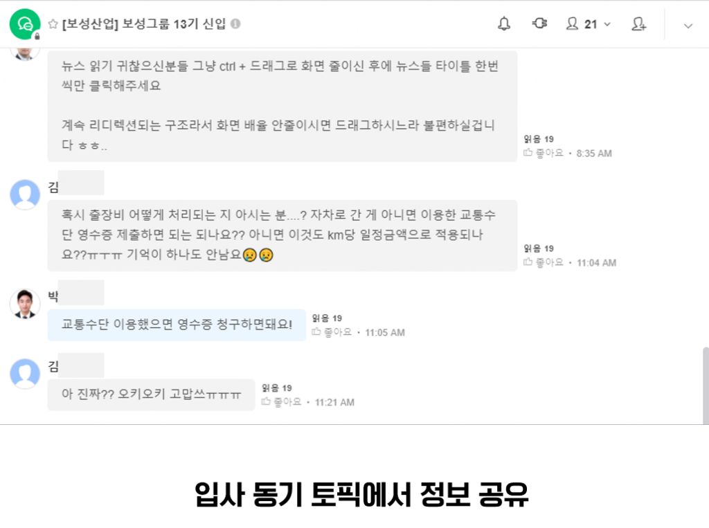 신입사원 동기들끼리 토픽을 만들어 사용하고 있습니다. 신입사원끼리 업무 상에 모르는 정보들을 서로 공유할 수 있어 좋습니다.