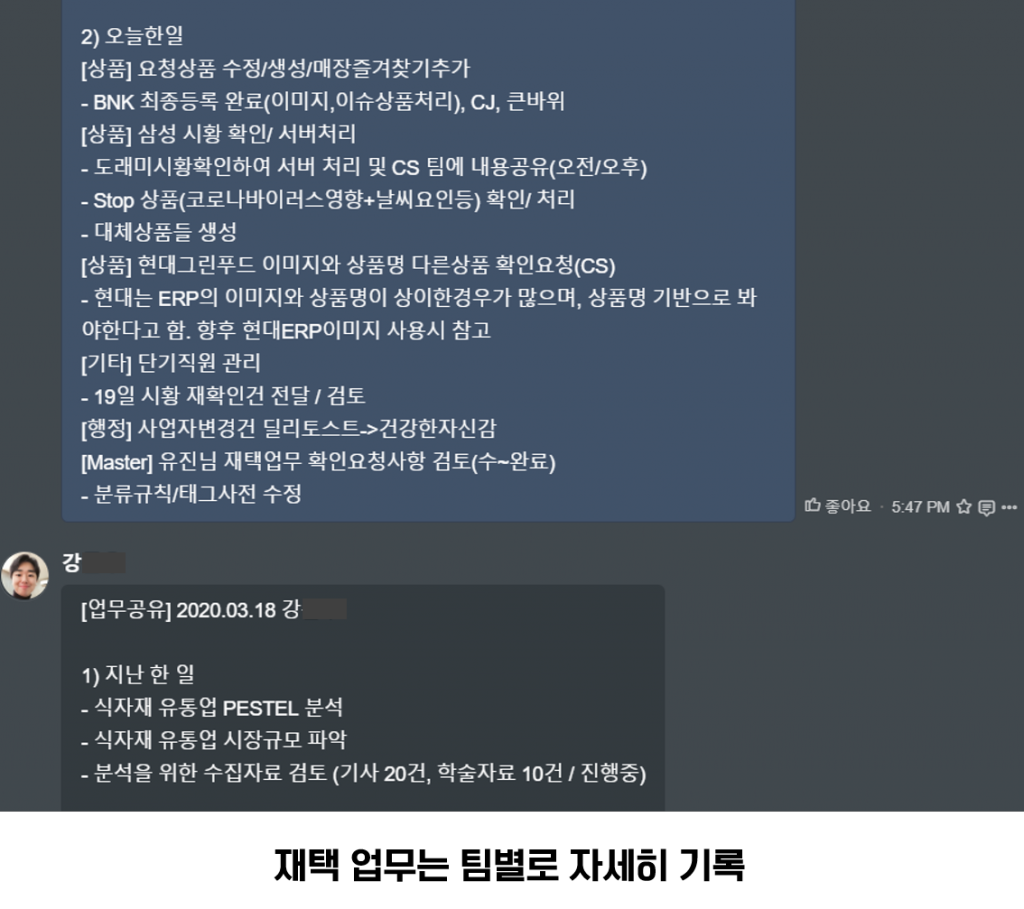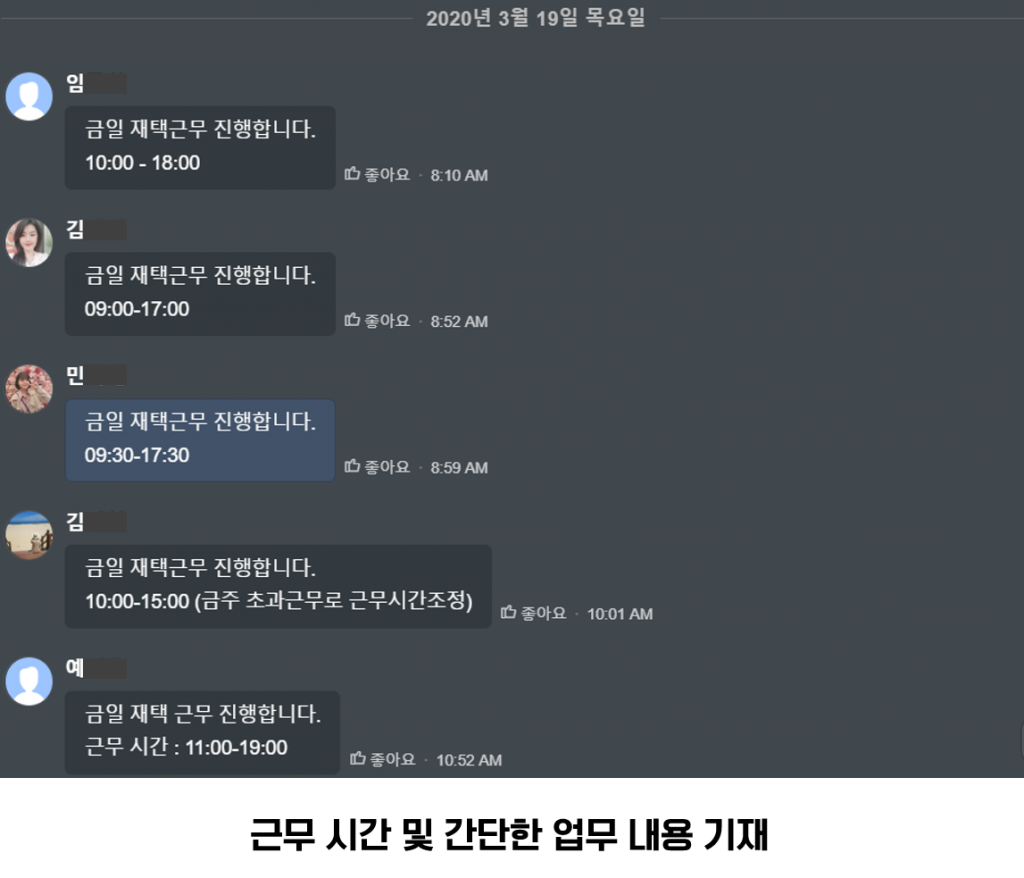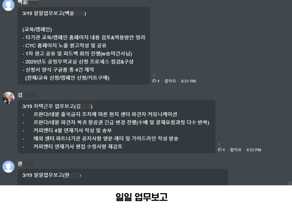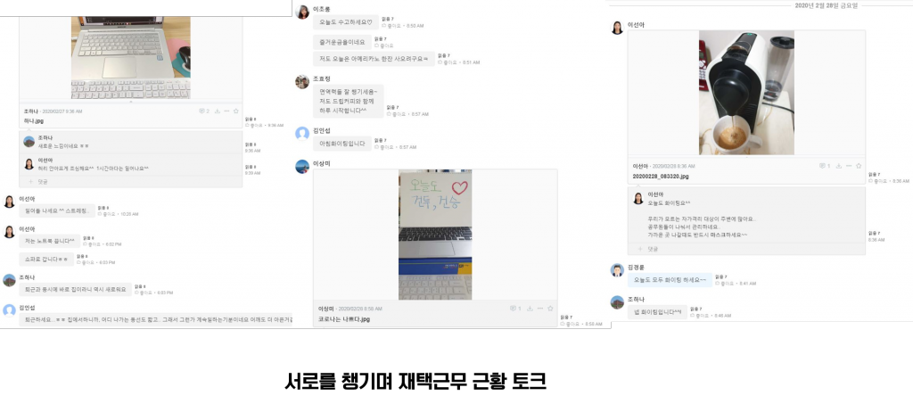 아름다운커피 팀은 7시부터 19시까지 자유롭게 하루 8시간를 지정하여 일할 수 있습니다. 재택근무 일일 업무보고 토픽에 오늘 완료한 일을 보고하고 서로의 업무를 점검하고 있습니다. 팀 회의는 팀 그룹챗을 만들어 진행하고 있으며 각종 일정 및 업무 일정을 조율하며 코로나 19에 대응하고 있습니다