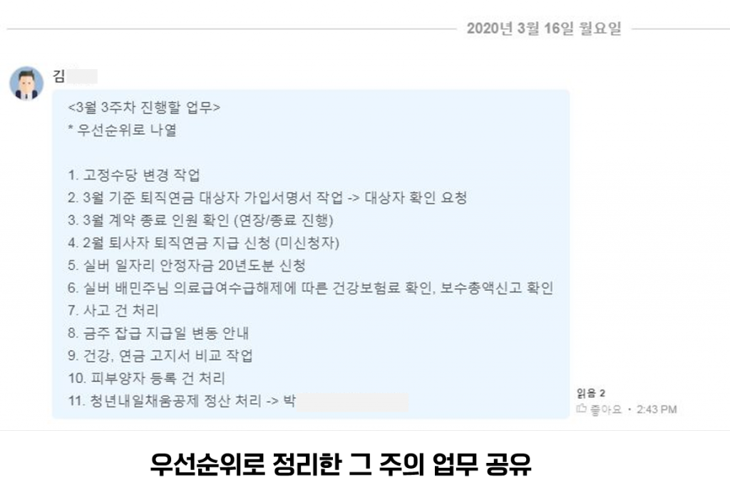 ‘감염병 관련 직원 공지방’ 토픽에서는 코로나19 바이러스 확산 방지 및 감염 예방에 대한 전사 차원의 공지사항을 전달하고 있습니다. 이에 따라 재택근무 연장 현황, 유연 출퇴근제, 휴게시간 시차 적용, 자차 운행 지원 등의 업무 지시를 부여받습니다.