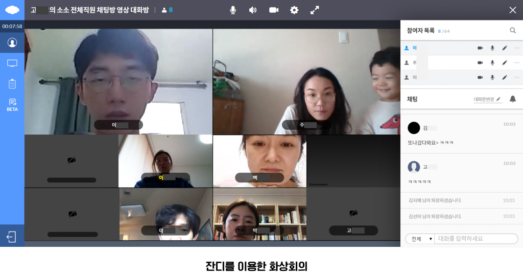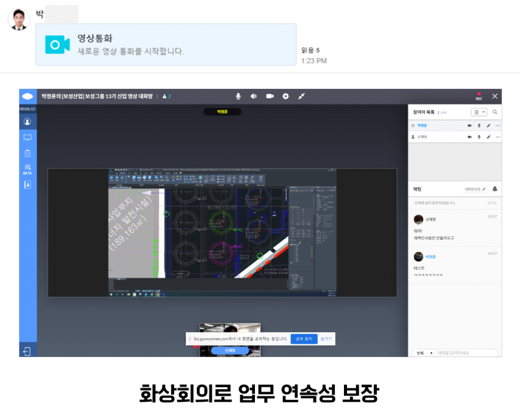 회의가 필요하다고 생각될 경우 상시로 화상회의를 열어 업무 연속성을 보장하고 있습니다. 그리고 화상회의 시 화면공유을 이용하면 보다 정확하게 업무관련 내용을 전달할 수 있습니다.