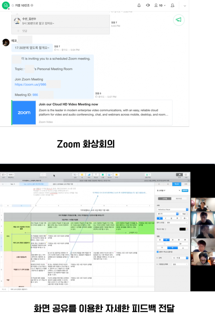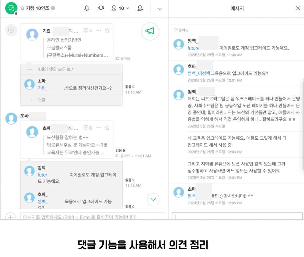 교사 회의도 역시 화상회의로 진행됩니다. 중요한 것은 주고받아야 할 정보가 유실되지 않게 하는 것입니다. 이럴 때 잔디는 더할 나위 없이 필요하죠. 특히나 정보의 양이 많아지면서 정보가 서로 섞이게 되면 소통이 어려워집니다. 지금은 잔디에서 모든 팀원들이 댓글 기능을 사용해서 필요한 정보를 공유하고 대화가 원만하게 이뤄지도록 합니다. 이전보다 의제에 댓글을 달면서 정리하는 활동이 많아졌습니다.