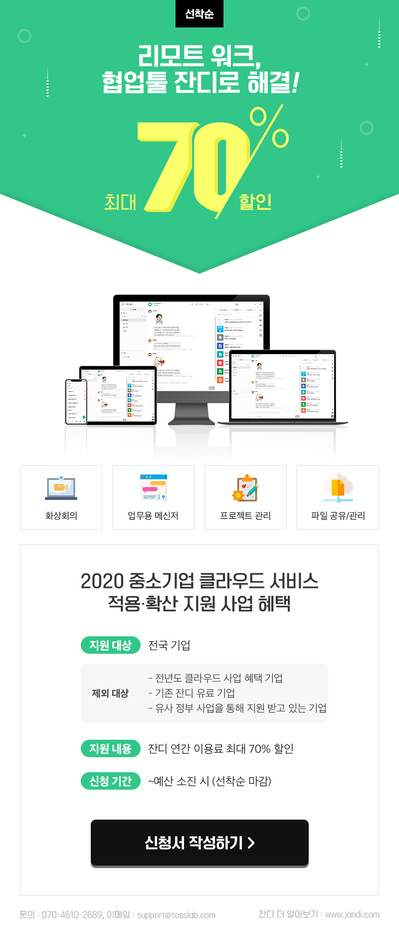 2020 중소기업 클라우드서비스 적용·확산사업 게시일: 2020. 05. 12 Share 🕑 리딩타임: < 1 분 많은 관심과 성원 감사드립니다. 사업 신청이 종료되었습니다. 선정된 기업에게 개별 안내가 진행중입니다. 감사합니다. 포스트 뷰: 1,698 메신저서비스업무용메신저업무용협업툴잔디 Share