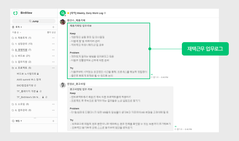 재택근무 업무 회고와 재택 기간 동안 일상을 소개하는 토픽을 통해 물리적으로 떨어져 있는 동료와 수월하게 소통하고 외롭지 않게 일상을 지낼 수 있었습니다.