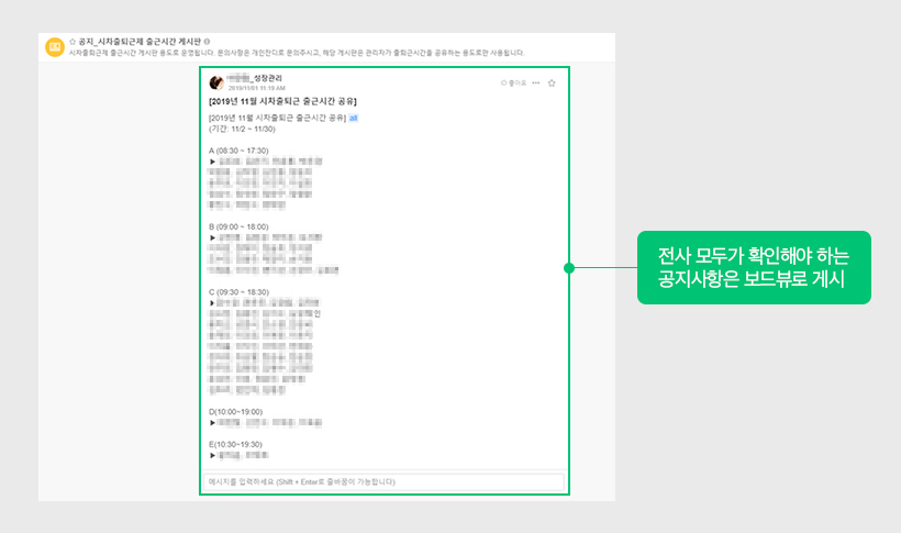 회사내 공지가 필요한 부분에 대하여 보드뷰를 활용하여 내용을 공유하고 관리합니다. 한 예로 성장관리팀에서는 시차 출퇴근제에 대한 내용과 같이 전사가 반드시 확인해야 하는 사항을 보드뷰를 통해 공지합니다.