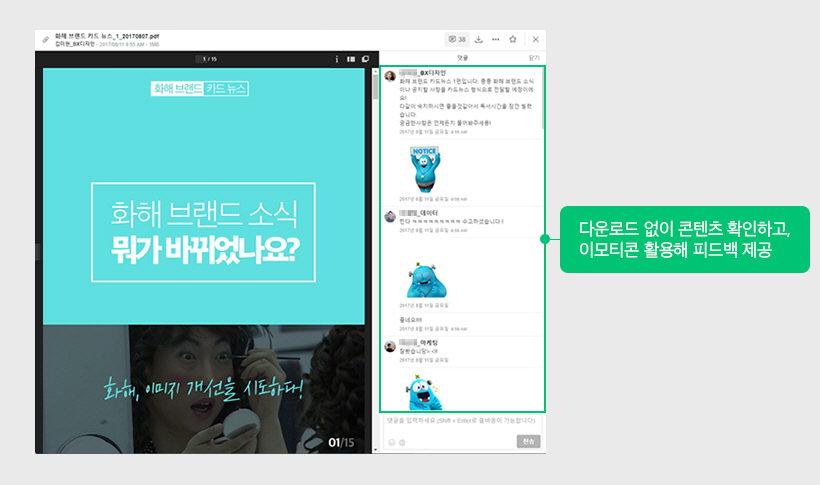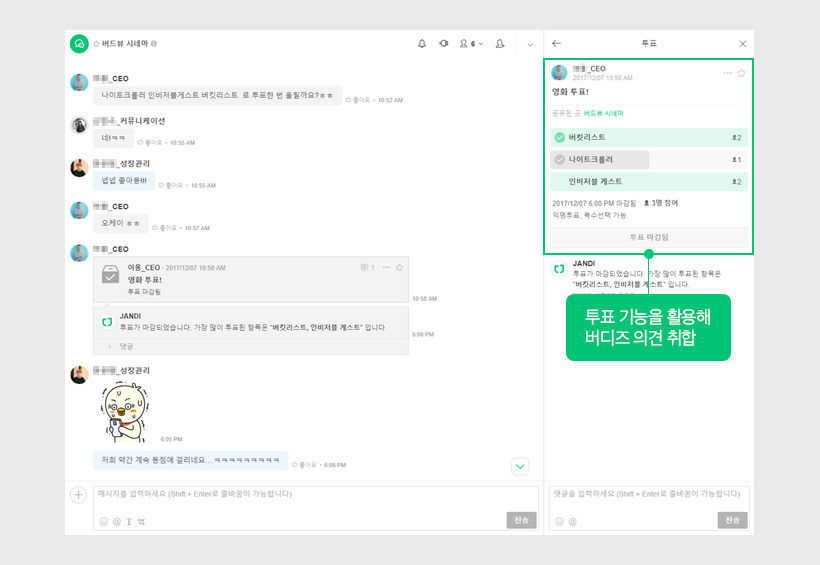 - 이모티콘: 버디즈와 즐거운 업무 소통이 가능합니다. 신규 출시되는 이모티콘이 항상 기대됩니다!