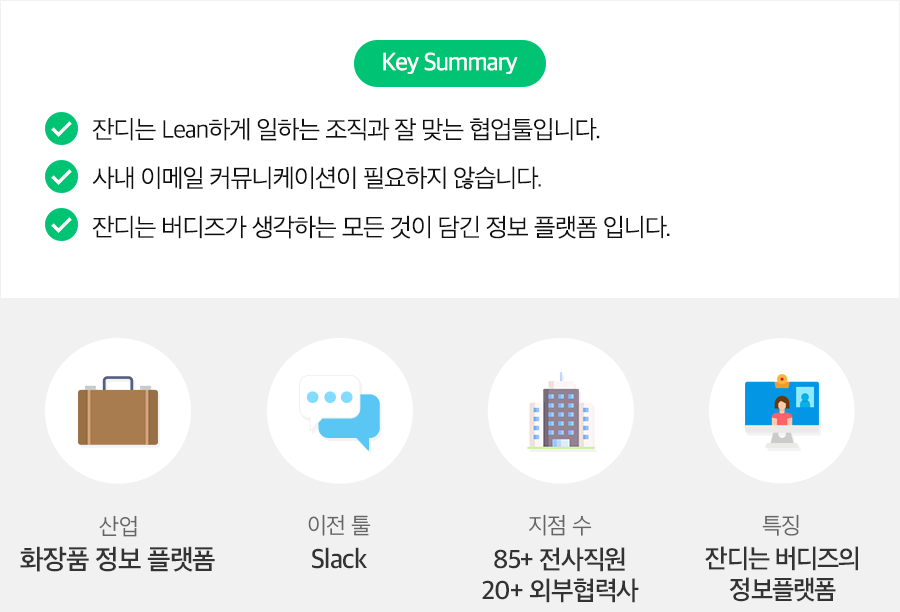 화해는 현재 대한민국 No.1 화장품 정보 플랫폼으로 현재 약 500만 개 이상의 화장품 리뷰가 있고, 2030 여성 절반이 사용하는 앱으로 성장했습니다. 조직도 함께 성장하며 빠른 소통채널이 필요했습니다. 개발팀이 사용하던 슬랙(Slack)을 사용하다 쉽고 간결한 UX/UI를 제공하고 외부 파트너들과 협력에도 용이한 ‘잔디’를 2016년에 전사 소통채널로 채택하여 지금까지 업무 플랫폼으로 활용하고 있습니다.