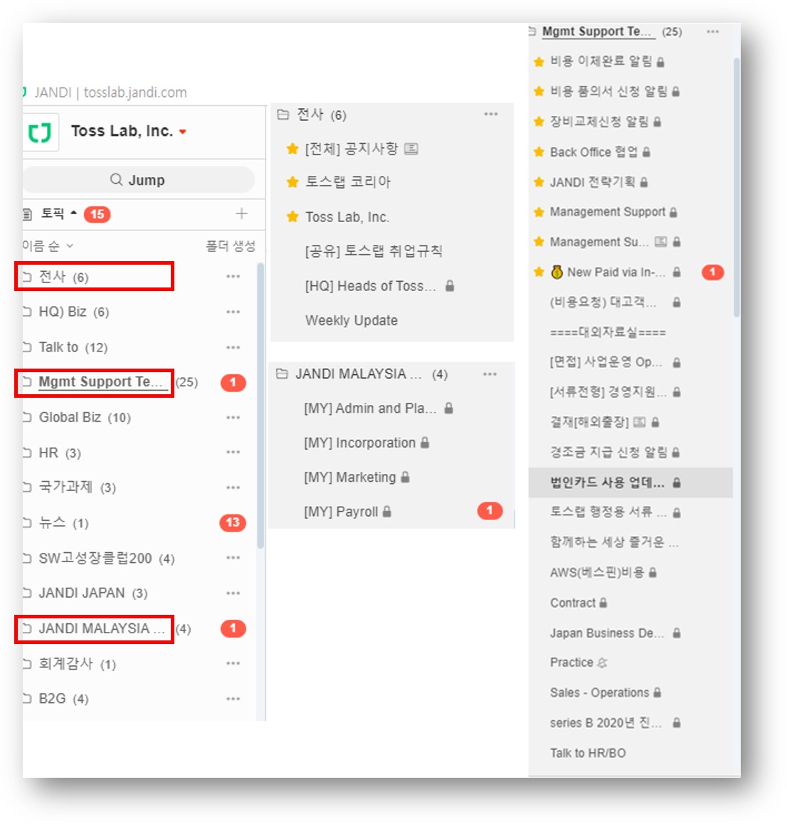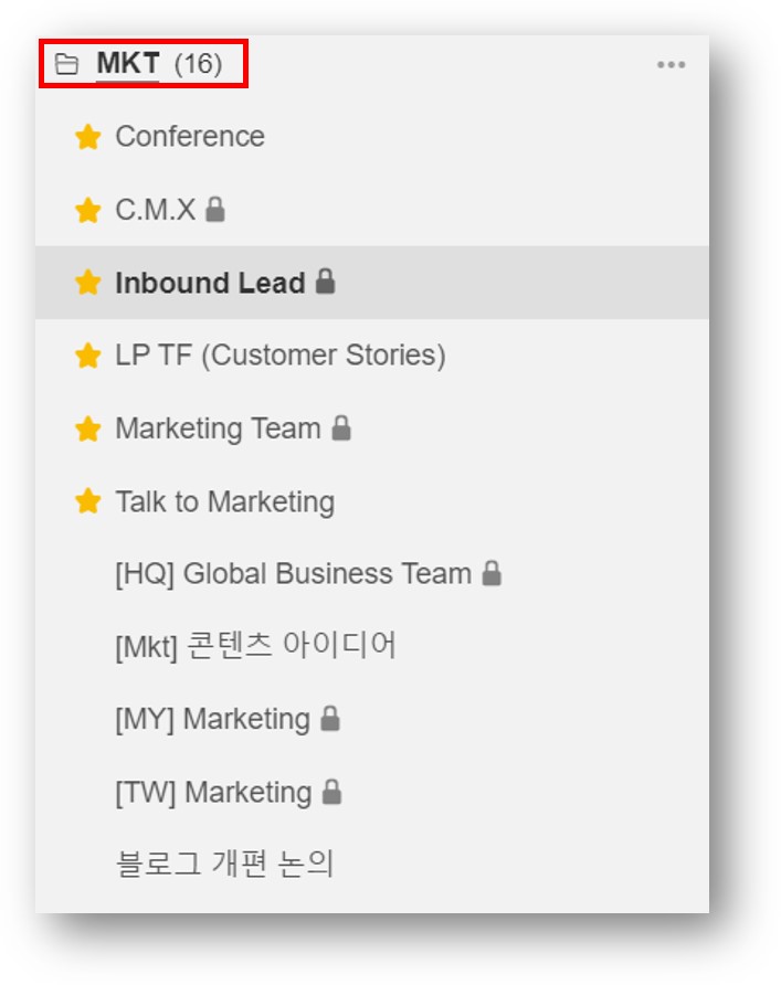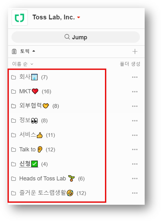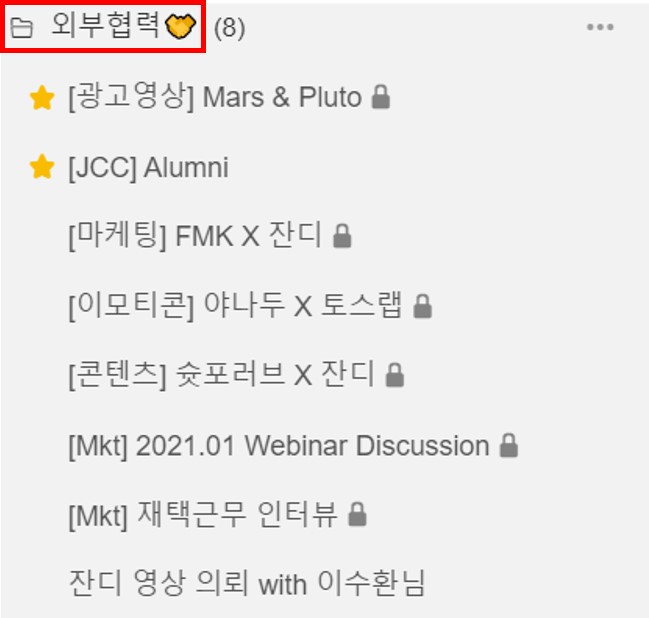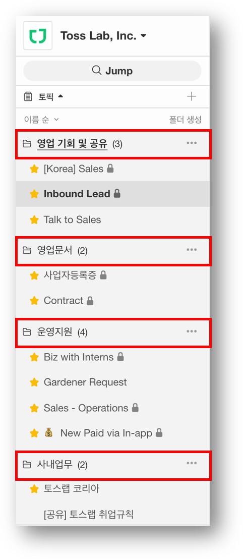 ✅ 타 팀 혹은 담당자와의 협업이 필요한 업무는 주제 별 토픽과 폴더로 구성했어요.
