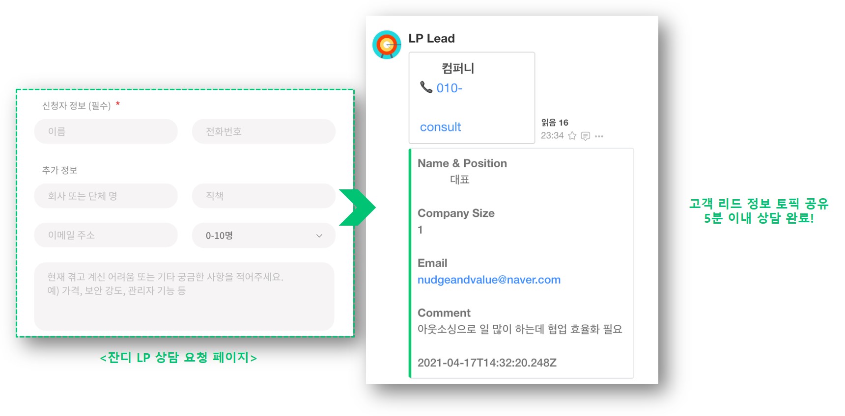 ✅ 잔디 홈페이지에 남긴 고객의 정보는 잔디 토픽으로 즉각 알림을 받아 신속하게 상담을 진행합니다.