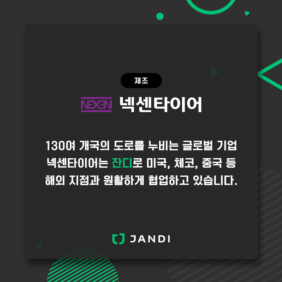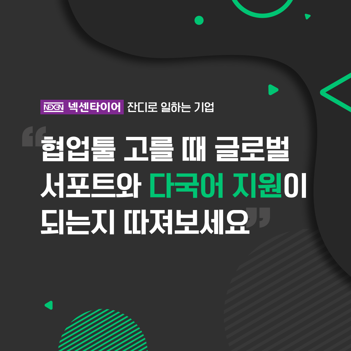 130여 개국의 도로를 누비는 넥센타이어도 글로벌 서포트와 다국어 지원을 하는 잔디로 협업합니다. 넥센타이어는 국내뿐만 아니라 미국, 체코, 중국 해외법인 그리고 해외 각국의 지점 등에 생산 거점을 두고 시장에 대응하고 있는 글로벌 기업입니다. 넥센타이어의 관리직, 주재원, 해외 관리직, 생산직 직원 등 약 1,700여 명 이상이 잔디를 통해 소통합니다.
