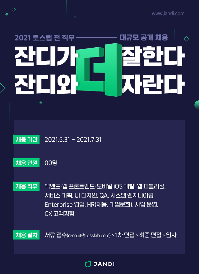 아시아 대표 업무용 협업툴 잔디(JANDI)를 서비스하는 토스랩이 ‘2021 전 직무 대규모 공개 채용’을 통해 잔디와 함께 성장할 경력 사원을 모집합니다. 토스랩은 국내 업무용 협업툴 시장 점유율 1위이자 연평균 100% 이상 성장하고 있는 글로벌 IT 스타트업으로 이번 대규모 공개 채용을 통해 서비스 개발과 사업 영역 확장을 함께할 인재를 영입하고자 합니다.