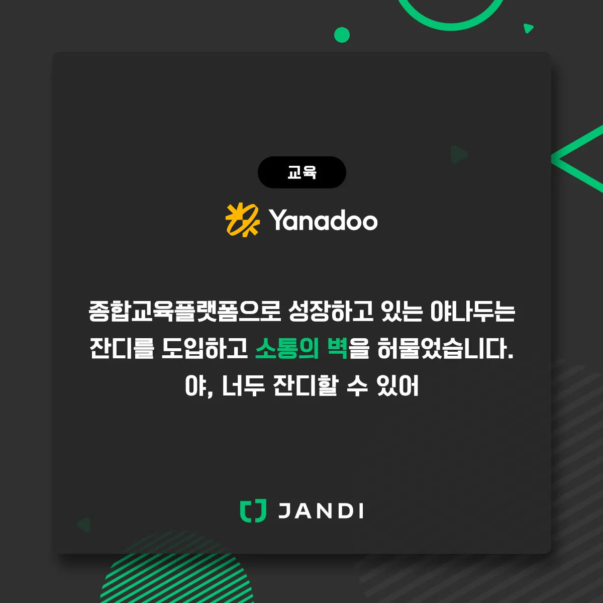 온라인 영어회화 시장에서 1위를 달성한 야나두도 잔디로 협업하고 있습니다. 야냐두는 동기부여 플랫폼 ‘야나두 유캔두’, 맞춤형 강의 서비스 ‘야나두 클래스’, 헬스케어 서비스인 ‘야나두 피트니스’ 등 새로운 서비스를 꾸준히 내놓으며 종합교육플랫폼으로 성장하고 있습니다.