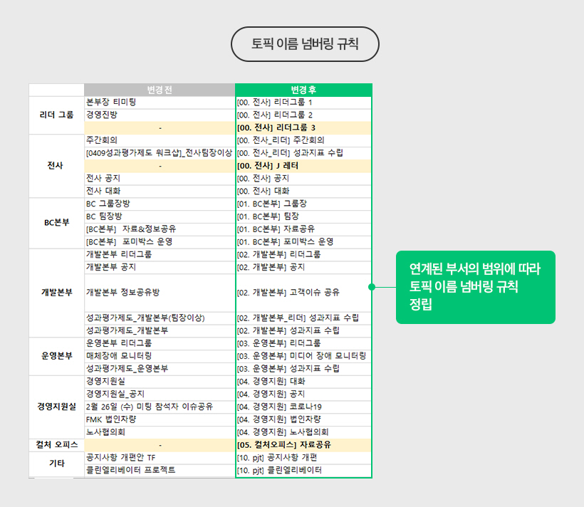 무한대로 늘어나는 토픽은 연계된 부서의 범위에 따라 토픽 이름에 넘버링 규칙을 정립해서 체계적으로 관리합니다. 1개 본부 안에서 진행되는 프로젝트는 ‘01’, 전사가 알아야 하는 이슈는 ’00’, 범부서적인 토픽은 ‘10’ 등 토픽의 명칭을 통일해 가시성을 높였습니다. 구성원들은 숫자를 보고 토픽의 목적을 직관적으로 이해하고 참여 필요 여부를 스스로 판단합니다. 토픽은 잔디의 폴더링 기능을 활용해 빠른 커뮤니케이션이 필요한 토픽 순으로 정리를 해뒀습니다. 모든 토픽의 생애 주기는 담당자 한 명이 관리하고 있습니다. 이름 규칙에 따라 새로운 토픽을 만들고 협업이 끝난 토픽은 클러스터로 옮겨 전반적인 프로젝트를 관리하고 있습니다. 끝난 프로젝트 토픽을 닫지 않고 아카이빙해둬 과거 프로젝트 히스토리를 관리할 수 있어 프로젝트가 많은 우리 회사에 용이합니다.