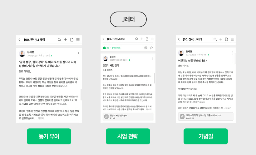 ‘J레터’는 대표님(윤제현)이 전 직원에게 보내는 편지를 공유하는 토픽입니다. 회사가 중요한 분기점에 서 있을 때 좋은 소식을 공유하거나 직원 전용 대출 상품 같은 복지 정책을 전하고 조직 문화 관련 공지사항을 대표님의 목소리로 직접 전달합니다. J레터는 2018년 사업을 론칭해 빠르게 성장해 업계 1위에 오른 이후에도 꾸준히 커지고 있는 포커스미디어가 추구하는 투명하고 수평적인 조직문화에 진정성을 더해주는 소통 창구입니다.